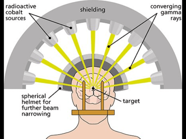 Gamma Knife uses about 200 small, individually weak beams of gamma radiation—typically from cobalt-60 sources—that converge precisely at a single focal point. Each beam alone is harmless to the tissue it passes through, but where the beams intersect, a high dose of radiation is delivered to the target. Thus, a ‘lethal’ dose of radiation is delivered to the target tissue, killing it; but the surrounding tissues are spared excessive radiation. Obviously, in the brain, sparing the surrounding normal brain from trauma is a great idea.